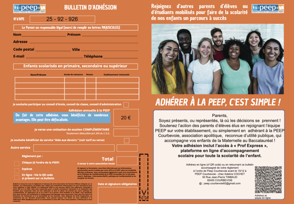 (*) L’adhésion est obligatoire si vous voulez participer aux conseils d’école, de classe ou conseil d’administration de vos établissements.